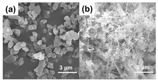 Microscopic morphology of (a) Al2O3 powder and (b) AlN whiskers.