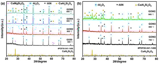 Figure 3a displays the XRD profiles for the GO50 and several GOW composites after a 2 h annealing process at 800 °C. Initially, the diopside (CaMgSi2O6; PDF #97-001-7043) crystalline phase is present in the GO50 sample. However, the introduction of AlN whiskers inhibits the formation of the diopside phase, as observed in the GOW2 sample. As the AlN whisker content further increases, the XRD patterns of the GOW4 sample begin to show the characteristic peaks of anorthite (CaAl2Si2O8; PDF #00-041-1486), and these peaks become more pronounced in the GOW6 sample. This observation suggests that AlN whiskers may act as nucleation sites for anorthite, thereby facilitating the crystallization of this phase within the composite material. Crystallization is a common phenomenon in LTCC composites, which is consistent with what has been reported in the review literature. Precrystallization is a common phenomenon in LTCC composites, which is consistent with what has been reported in the review literature [38]. The precipitated crystalline phases will have a significant impact on the thermal properties [33] in addition to contributing positively to the dielectric properties [34,35,36].