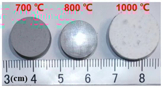 Figure 5 displays the final digital photos of GOW4 disk samples (original diameter is 15 mm) after 2 h of sintering at different holding temperatures (700 °C, 800 °C, and 1000 °C). As seen from the images, the samples held at 700 °C were under-sintered, those held at 800 °C exhibited shrinkage, and those held at 1000 °C experienced significant expansion. These roughly reflect the trend of volume change in GOW4 during sintering, and from the results we can see that sintering at a higher temperature like 1000 °C may lead to a decrease in the density of the samples.