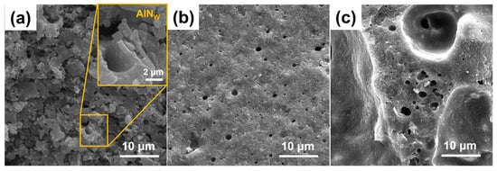 As soon as the temperature rose to 800 °C (Figure 6b), the glass generated an adequate amount of liquid phase, allowing ceramic particles to be thoroughly wetted and rearranged. The process of wetting and particle rearrangement plays a pivotal role in enhancing the density of the final product, promoting the encapsulation of AlN whiskers within the glass matrix, and facilitating the exclusion of pores. Consequently, the increase in density leads to a noticeable reduction in macroscopic volume.
