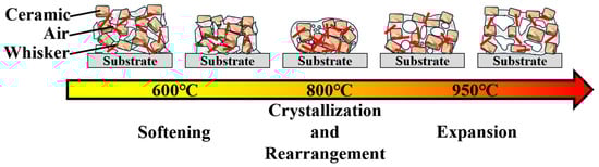 When the temperature further increased to 1000 °C (Figure 6c), the GOW4 sample experienced abnormal expansion, internally developing a porous structure, which caused a dramatic increase in macroscopic volume. This phenomenon is associated with crystallization. The density of anorthite is 2.76 g/cm3 [39], which is slightly lower than the density of the composite, and the precipitation of a large number of crystalline phases also leads to the expansion of the composite. In addition, the originally highly fluid glass phase precipitated a large amount of crystalline phases, leading to a significant decrease in fluidity [40]. The premature closure of the pores prevents the escape of air, and the two causes eventually combine to cause the whole volume to expand. As can be seen in Figure 4, the densification of the samples used in this work started to be affected around 850 °C, and by about 930 °C, the densification process of all samples had ceased. This process is schematically illustrated in Figure 7.