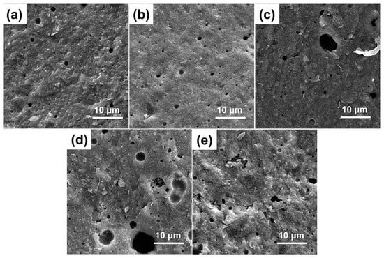 Figure 8 illustrates the fracture surface micromorphology of specimens with varying AlN whisker concentrations after being held at 800 °C for a duration of 2 h. Since the AlN whiskers promote the crystallization of CMZBS glass at high temperatures, when the whisker content increases, the number and diameter of pores in the composites increase, and thus the fracture surface will gradually become loose and rough. The increase in pore quantity and diameter might have led to a decrease in the overall density of the composites, which in turn affected their mechanical properties. Additionally, these pores could be accelerating the material’s fracture process. Thus, the concentration of added AlN whiskers must be carefully optimized to balance the performance enhancement they provide with the potential drawbacks of increased porosity and structural looseness.
