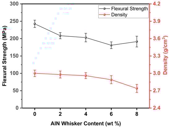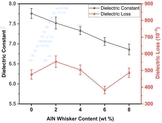 Because of its outstanding mechanical, chemical, electrical, thermal, and high-temperature physical properties [14,15], aluminum nitride (AlN) holds great potential in the field of LTCC materials [24,25,26]. The introduction of nitride whiskers is anticipated to markedly improve both the thermal and dielectric properties of oxide-based LTCCs [24,25,26]. In view of the above, CMZBS/Al2O3/AlN-whisker–glass–ceramic composites with high densities and excellent overall performance were prepared in this study. The introduction of a small amount of AlN whiskers (2 wt.% to 8 wt.%) was shown to be a reliable way to optimize the thermal and dielectric characteristics of ceramics while retaining the intrinsic parameters of the composites.