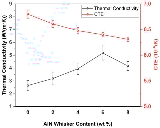Figure 10 presents the thermal conductivity and coefficient of thermal expansion (CTE, at 200 °C) of the composite materials. The data indicates that the CTE of the composites decreased monotonically with the addition of AlN whiskers. This reduction is primarily due to the formation of pores, which disrupt the continuous path for heat transfer. However, the thermal conductivity of the composites showed a non-monotonic trend with increasing AlN whisker content. In the case of the GO50 sample, the thermal conductivity was 2.64 W/(m·K). This was because the Al2O3 particles were isolated by a glass phase with relatively low thermal conductivity, hindering efficient heat transfer. Upon increasing the AlN whisker content to 6 wt.%, the thermal conductivity reached a peak of 5.17 W/(m·K), which is a substantial 95.83% increase compared to the GO50 sample. This improvement is attributed to the fibrous structure of the AlN whiskers, which act as thermal conduction bridges, connecting the isolated Al2O3 particles and enhancing heat transfer throughout the material. Nevertheless, when the AlN whisker content surpassed 6 wt.%, the thermal conductivity of the sintered sheets declined to 4.16 W/(m·K). This decrease may be due to the rapid reduction in density, as depicted in Figure 8e, where the ceramic matrix becomes filled with air, reducing the matrix density and impeding the formation of a conductive network. The presence of air voids disrupts the continuous thermal pathways, thus lowering the overall thermal conductivity of the composite.