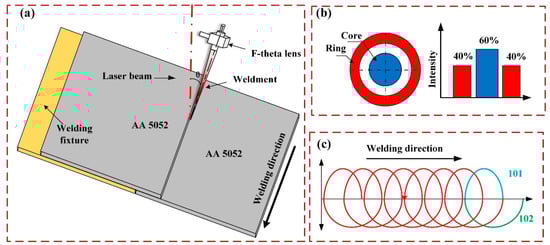 (a) Schematic diagram of ARM laser welding; (b) energy distribution of core/ring laser; (c) laser oscillation trajectory.