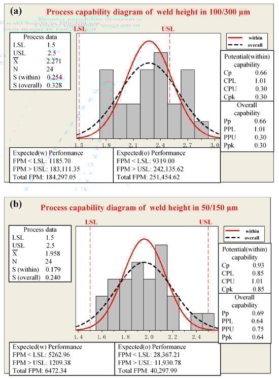 Process capability diagram of weld heights with different fiber core diameters: (a) 100/300 µm; (b) 50/150 µm.
