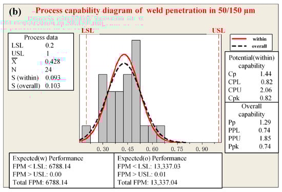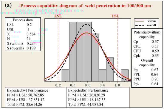 Process capability diagram of weld penetration with different fiber core diameters: (a) 100/300 µm; (b) 50/150 µm.