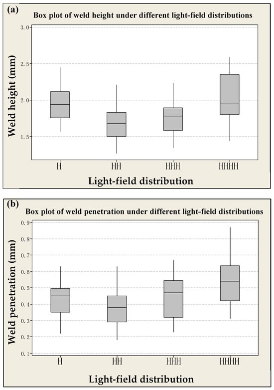 Box plot of different light-field distributions: (a) weld height; (b) weld penetration.