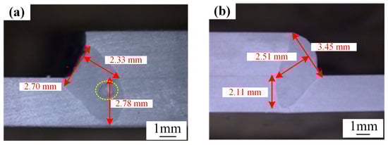 Firstly, a comparative test of two welding processes, specifically, low-power and slow-speed welding (with p = 2650 W and v = 2.7 m/min) and high-power and fast-speed welding (with p = 5300 W and v = 5.4 m/min), is carried out under identical conditions (where A = 1.6 mm, f = 120 Hz, θ = 40°, and the laser spot is positioned at the middle of the side of the upper substrate). Based on Equation (9) [], the welding heat input for both processes is calculated to be 59.6 J/mm.