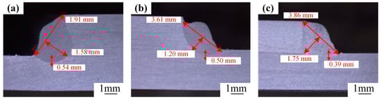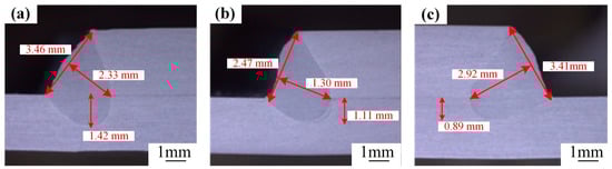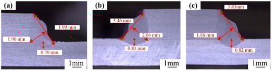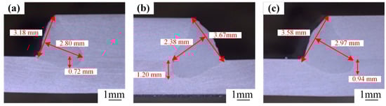 Weld cross-sectional morphology with different oscillation frequencies: (a) 200 Hz; (b) 250 Hz; (c) 300 Hz.