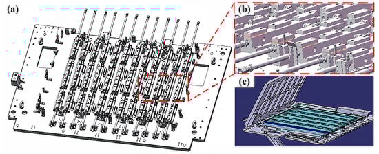 (a) Overall design of the welding fixture; (b) partial enlargement of the fixture; (c) Schematic diagram of the anti-deformation plate.