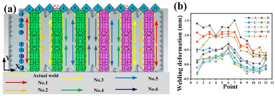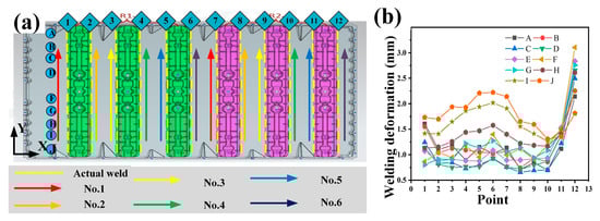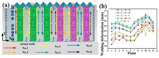 Three distinct welding paths are utilized to accomplish the welding procedure. Subsequently, a comprehensive comparison is conducted to assess the impacts of these welding paths on welding deformation. Figure 15 depicts the welding approach of Path 1 and showcases the meticulously collected welding deformation data at various positions. In Figure 15a, arrows of diverse colors denote the welding sequence. Specifically, the red arrow symbolizes the first weld, and the yellow arrow represents the second weld. During the welding operation, two robots are deployed to work concurrently. Robot 1 undertakes the welding task of the green-colored area, while Robot 2 is assigned to weld the pink-colored area. The yellow straight line in the figure designates the actual location of the weld. To mitigate deformation, an intermittent welding technique is implemented. Figure 15b presents the collected welding deformation measurements at 12 positions (points 1–12) along the X-axis and 10 positions (A–J) along the Y-axis. The results reveal that the welding deformation associated with Path 1 is predominantly concentrated at the No. 6 weld (point 6 and point 12). The maximum deformation attains a value of 3.105 mm, and the overall deformation exhibits a pronounced tendency to propagate in the X-direction. Through in-depth analysis, it is postulated that the heat generated during the welding process migrates towards the X-direction, where the temperature is relatively lower. This leads to an asymmetrical heat input on either side of the base plate, ultimately resulting in the occurrence of welding deformation in the base plate. Intriguingly, the deformation manifested under Path 1 is a positive deformation, characterized by an upward bulge.