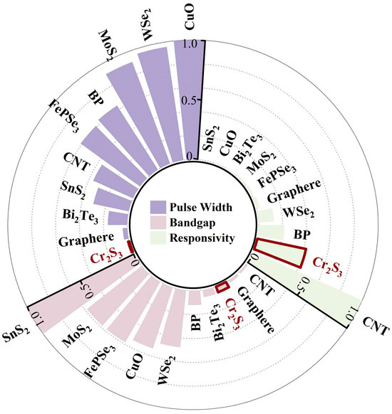 Comparison of commonly used saturable absorbers in terms of bandgap energy (pink), responsivity (green), and mode-locked pulse width (purple). All parameters are normalized for clarity. Data for bandgap energy and responsivity are referenced from [23,25,26,27,28,29,30,31,32,33], while mode-locked pulse widths are compiled from [34,35,36,37,38,39,40,41,42]. The three characteristics of the materials in this study are labeled in the figure.
