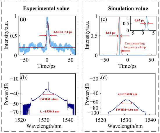To evaluate the accuracy of the proposed model, a corresponding simulation framework is constructed based on the experimental setup, fiber parameters, and central wavelength reported by Yang et al. [20]. A comparison between the experimental and simulated results was performed. As shown in Figure 2a,b, the mode-locked soliton observed in the experiment exhibited a pulse width of 4.60 ps and a spectral bandwidth of approximately 4 nm, yielding a TBP of 2.36. The simulated results under the corresponding parameters, presented in Figure 2c,d, reveal mode-locked solitons with a pulse width of 4.61 ps and a spectral bandwidth of 4.04 nm. The comparison in Figure 2 demonstrates excellent agreement between the experimental and simulation results, thereby validating the accuracy of the proposed model. This model can thus serve as a reliable tool for investigating pulse evolution dynamics in fiber lasers.