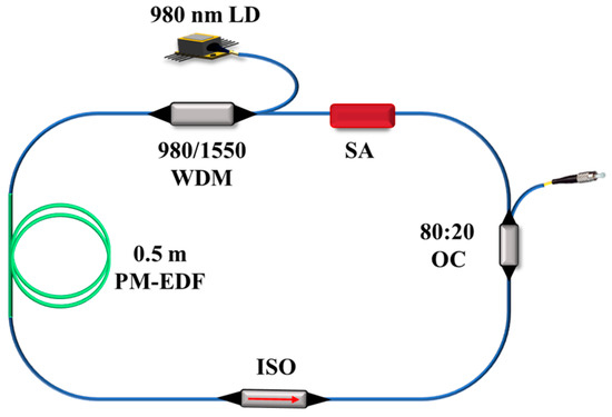 The introduction of substantial net negative dispersion within the cavity results in a relatively broad mode-locked soliton pulse. Further reduction of the net dispersion in the cavity is advantageous for narrowing the pulse width of mode-locked solitons. Based on this premise, a laser simulation model is designed, as illustrated in Figure 3. A 0.5 m high-doped polarization-maintaining EDF serves as the gain medium, with a 980 nm laser diode providing the pump source. The pump light is coupled into the laser via a 980/1550 nm wavelength division multiplexer. The cavity is constructed entirely with polarization-maintaining fiber components. After passing through a fiber isolator to ensure unidirectional pulse propagation, the intracavity signal with a central wavelength of 1550 nm is extracted via an 80:20 coupler. Most of the laser is directed through the SA for pulse modulation based on its saturable absorption characteristics, while a small portion is output through the coupler to complete the fiber laser ring cavity.