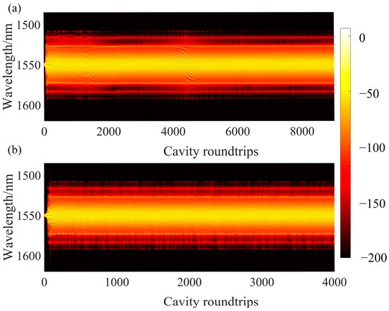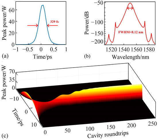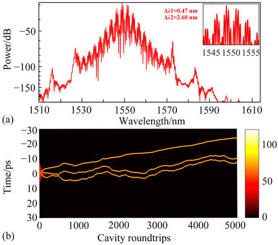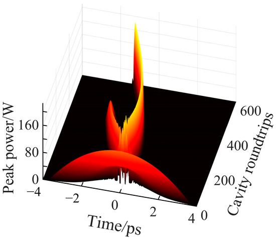 Based on the constructed physical model and the parameters of the Cr2S3 SA, an optimized cavity design, as depicted in Figure 3, is developed to maintain a net dispersion of −0.035 ps2 within the cavity. By controlling the intracavity gain, the rich nonlinear effects are adjusted, thereby revealing the pulse evolution within the cavity. The pulse evolution process in the fiber laser is characterized in terms of roundtrip time and the number of roundtrips.