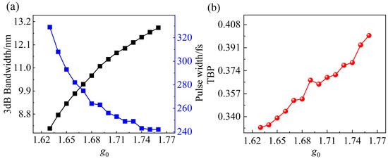 (a) Variation of the 3 dB spectral bandwidth (black) and mode-locked pulse width (blue) as a function of the small-signal gain coefficient g0; (b) evolution of TBP with g0. As g0 increases, the TBP deviates from the transform-limited value, reflecting the impact of gain narrowing on pulse quality.