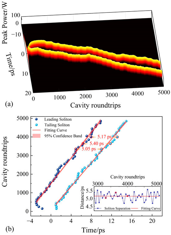 As shown in Figure 8b, at 3350 cavity roundtrips, the soliton separation is 5.05 ps, which is relatively small. Under these conditions, the solitons repel each other, leading to an increase in their separation. At 3650 roundtrips, the soliton separation reaches a maximum of 5.40 ps. For this relatively large separation, the solitons attract each other, causing the separation to decrease. By 4000 roundtrips, the pulse spacing stabilizes at 5.17 ps. In all cases, the soliton pair adjusts toward the equilibrium distance, signifying the formation of a stable double-bound soliton state [55]. From the fitted curve, it is evident that once the soliton pair stabilizes, the net negative dispersion within the laser cavity induces periodic interactions between the solitons and the cavity dispersion. These interactions result in periodic perturbations of the solitons, maintaining a dynamic equilibrium in the spacing between the soliton pair. The intracavity pulse evolution is extended to 5000 cavity roundtrips to analyze the fluctuation range of the separation between loosely bound solitons. As shown in the illustration of Figure 8b, the results indicate that the soliton separation fluctuations remained within a range of ±0.5 ps. This demonstrates that the system exhibits satisfactory stability. The result in this paper is similar to that reported in reference [56], which demonstrated quasi-periodic pulsating pure-quartic solitons (PQS) molecules. The quasi-periodic pulsation feature of the PQS molecules is characterized by small oscillations of ±0.4 ps around a distance of approximately 12.5 ps between two pulses. In contrast, the bound soliton pulse spacing in this study is even smaller, leading to stronger interactions.