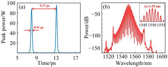 By measuring the spectral modulation period as 1.55 nm, the corresponding pulse interval is calculated to be 5.17 ps using this equation. This result aligns well with the pulse interval measured in the simulation shown in Figure 9a, further confirming that the observed dual pulses correspond to double-bound solitons.