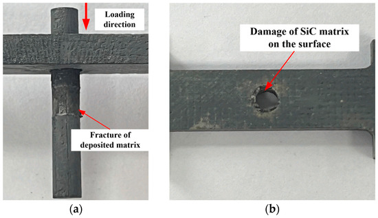 In the joining of CMCs in specific fields, the riveting process is often employed. However, as the force transmission between rivets and hole walls mainly depends on friction and mechanical interlocking, its joining strength is relatively low. When subjected to large tensile or shear forces, it is prone to shear deformation or pull-out. Xu et al. [15] investigated the failure mechanism of C/SiC riveted joints under thermo-mechanical coupling loads. It was revealed that the predominant failure mode of C/SiC riveted joints was a brittle fracture of the interface layer between the rivets and the plates, as depicted in Figure 3. During the failure process, due to the friction resulting from interference fit, the progressive damage was mainly concentrated on the surface of the C/SiC composite material. As the environmental temperature increased to 800 °C, the out-of-plane ultimate strength of the C/SiC riveted joints decreased. Xu et al. [16] studied the impact of temperature changes and the residual stress generated by riveting interference fit on the properties of C/SiC composite materials by combining experimental and simulation analysis methods. Owing to the release of residual stress enhancing the interface performance, the fracture cross-sectional morphology transformed from the tortuous pull-out of fibers to neat brittle fracture. At room temperature, the rivets moderately enhanced the load-bearing capacity of C/SiC composite materials. Nevertheless, as the environmental temperature increased, the load-bearing capacity decreased significantly.