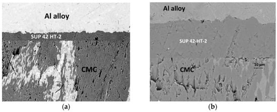 (a) Scanning electron microscope (SEM) cross-sectional micrograph of the CMC/EN AW—6082 joint using SUP42 HT-2 (Master Bond, The USA) adhesive and post-heat-treated at 200 °C for 10 min, and (b) magnified view of the interface [26].