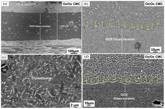 SEM images of the joint and GOX microcrystalline glass crystallization. (a) Cross-sectional view of the joint; (b) cross-sectional view of the joint in backscattered electron mode (the arrow indicates the bonding interface); (c) crystalline phase (bright color) in the glass matrix (dark color); (d) cross-sectional view of the joint after thermal aging for 100 h at 850 °C in air (the arrow indicates the bonding interface) [28].