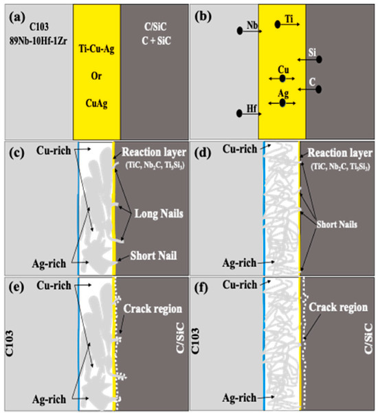Microstructural evolution mechanisms: (a) before joining; (b) during brazing, joint based on Ticusil filler; (c) after brazing, joint based on Ticusil filler; (d) after brazing, joint based on Cusil filler; (e) during LSS testing, joint based on Ti-Cusil filler; (f) during LSS testing, joint based on Cusil filler [36].