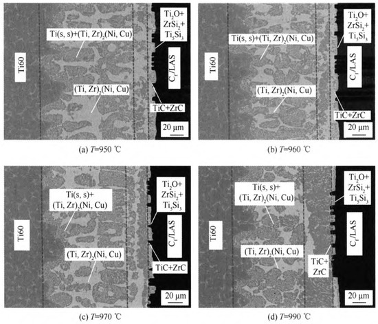 Brazing represents the most prevalently employed technique in the soldering of CMCs. It makes use of brazing filler metal, whose melting point is lower than that of the base material, as the filling medium. Upon being heated to the designated brazing temperature, the brazing filler metal liquefies and wets the base material. Subsequently, it infiltrates the joint gap via capillary action and diffuses with the base material, thereby effectuating the joining. The relatively low brazing temperature serves to preclude excessive thermal impairment to the composite material. Moreover, it exhibits a high degree of flexibility in accommodating the connection of complex geometries [35]. Anurag et al. [36] employed commercially available Ti-containing Cu-Ag alloy brazing filler metals with high activity (Ticusil) and low activity (Cusil) to successfully establish the brazing joining between C/SiC composites and niobium alloy C103. Through a detailed analysis of the microstructural characteristics of the joints and fracture surfaces, it was ascertained that the joint interface was devoid of cracks and pores, exhibiting a sound microstructure. Notably, the fracture surfaces of Ticusil-based and Cusil-based joints manifested significant disparities, with distinct crack propagation patterns. The micro-evolution mechanism is illustrated in Figure 9. Subsequently, a quadratic model was constructed via response surface methodology (RSM) analysis to prognosticate the impact of temperature, reaction time, and cooling rate on the lap shear strength of the joints. The predicted values demonstrated a high degree of congruence with the experimental ones. The strength and high-temperature resistance of brazed joints are limited by the properties of the brazing filler metals, and thus some new brazing filler metal systems are continuously being explored. Wang et al. [37] fabricated CaO-Y2O3-Al2O3-SiO2 (CYAS) glass and employed CYAS glass powder as the solder for joining SiCf/SiC composites. As the brazing temperature ascended, the intermediate layer became dense and devoid of defects, concomitantly leading to an augmentation in the joint shear strength. The optimal temperature was determined to be 1400 °C, at which point the average joint strength reached 57.1 MPa. The holding time at 1400 °C exerted a minimal influence on the intermediate layer. Extending the holding time was conducive to eradicating residual bubbles and facilitating the infiltration of the solder, with 30 min identified as the optimal holding duration. Donatella et al. [38] adopted Si-16.2Ti alloy as the brazing filler metal and accomplished the joining of the composites by the reactive infiltration process. They experimentally investigated its wettability and microstructural evolution on glassy carbon and SiC substrates, and analyzed interfacial phenomena including wettability, reactivity, and interfacial microstructural evolution, thereby furnishing a foundation for the selection of appropriate joining process parameters (temperature, time, atmosphere). Hu et al. [39] employed a Ti-Zr-Ni-Cu active alloy to braze continuous carbon fiber-reinforced lithium aluminosilicate glass–ceramic matrix composites (Cf/LAS composites) and Ti60 alloy. It was observed that with the increase in brazing temperature, the reactants in the intermediate layer increased, and the shear strength of the joint initially increased and then decreased. By investigating the microstructure of the brazed joint interface, as shown in Figure 10, the mechanism of fracture failure was revealed at the joint. Wang et al. [40] investigated the performance of Cf/SiC-GH3044 joints by adding diamond (C) powder to the Cu-Ni-Ti brazing filler. It was discovered that the addition of C powder could effectively enhance the mechanical properties and high-temperature resistance of the joints. The analysis of the joint’s microstructure indicated that the addition of C particles inhibited the excessive growth of the brittle compound layer and simultaneously increased the initial liquefaction temperature of the intermediate layer. The room-temperature shear strength of the joint initially increased and then decreased. When both C and Ni powders were added simultaneously, a similar trend was observed; however, a higher joining temperature and a longer holding time were required to obtain a good joint. The high-temperature shear strength of the joint generally decreased, but as the amounts of C and Ni powders added increased, the reduction in strength gradually diminished.