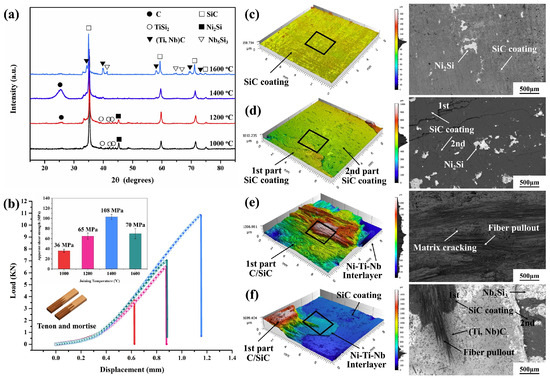 (a) XRD patterns of the C/SiC fracture after single-lap shear strength test; (b) Shear strength of C/SiC joint; 3D images and BSE images of C/SiC joint fracture: (c) NS1 1000 °C, (d) NS2 1200 °C, (e) NS3 1400 °C, and (f) NS4 1600 °C [43].