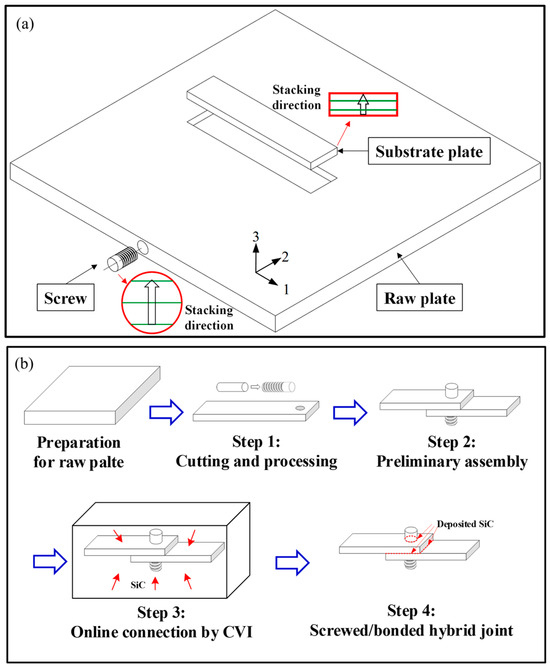 Explanation of the preparation and assembly process of the hybrid joint: (a) material orientation of the substrate and screw; (b) assembly process of the hybrid joint [48].