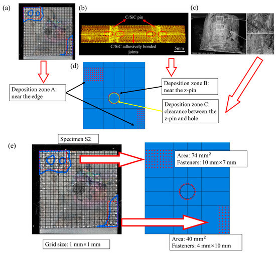 Three types of SiC deposition zones in the C/SiC z-pinned/bonded hybrid single-lap joint: (a) deposition zone A: near the edge; (b) deposition zone B: near the z-pin; (c) deposition zone C: gap between the z-pin and hole; (d) numerical model; (e) distribution of fasteners with similar area in deposition zone A [49].