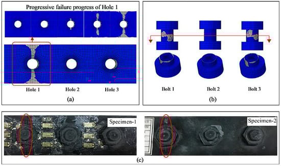 Bolt joining is a common mechanical joining method for CMCs. It can endure relatively large tensile, shear, and other loads and can apply to structural connections with high load-bearing capacity requirements [12]. However, as CMCs are often used in high-temperature and high-pressure environments, higher demands are imposed on bolted joining structures, which need to be fully considered in design and application. Zhao et al. [13] developed a finite element model, as shown in Figure 2, to simulate the thermal structural behavior and high-temperature tensile performance of a single-lap single-bolt ceramic matrix composite/high-temperature alloy joint through progressive damage analysis. It was found that the thermal expansion mismatch between CMCs and high-temperature alloy materials led to a sharp drop in preload and an unfavorable change in bolt–hole clearance. Temperature had a significant impact on the tensile performance and damage propagation of the joint structure. Zhao et al. [14] established a finite element model and used progressive damage analysis to study the influence of geometric parameters of double-bolt joints on failure load and damage mechanism at 750 °C. It was found that edge distance significantly affected the high-temperature bearing capacity of double-bolt joints, showing a trend of first increasing and then decreasing. A larger edge distance would change the stress concentration at the hole edges of ceramic matrix composite plates and bolt tightening efficiency. Plate edge distance and center-to-center spacing of double bolts had relatively little impact on the failure load of the connection structure at 750 °C. An increase in plate edge distance would slightly increase connection stiffness and enhance joint strength under the same failure load. When the center-to-center spacing of double bolts was different, the failure modes of CMCs were different, and multiple failure modes interact to cause changes in failure loads.