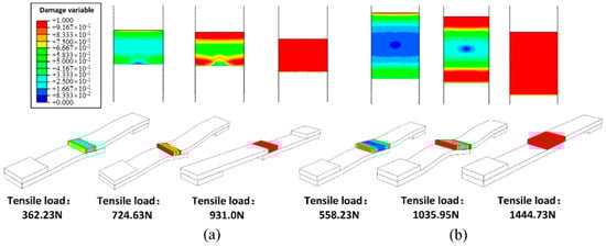 Simulation of the failure process: (a) SiC bonding layer in the semi-lap region; (b) SiC bonding layer in the entire lap region [60].