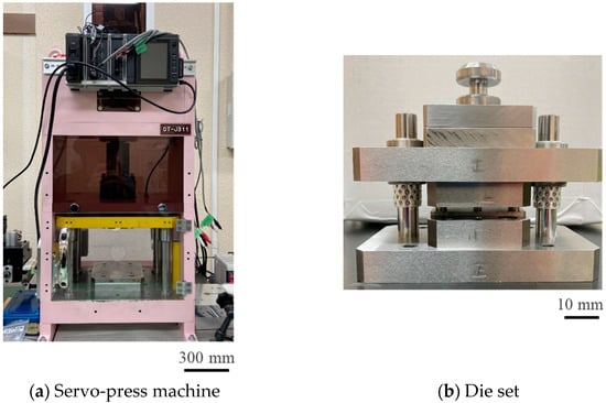 The screw servo stamping system (Precise Stamping Laboratory, DT-J311; Tokyo, Japan) was utilized to punch out the work materials, as shown in Figure 1a. The stroke was measured using the laser displacement meter (KEYENCE, SI-F01; Tokyo, Japan) and data acquisition system (KEYENCE, NR-600; Tokyo, Japan). Non-oriented Fe-3Si electrical steel sheets, with a thickness of 500 μm (NIPPON STEEL Corp., 50H310; Tokyo, Japan), were used as the work material. The WC (Co) die in Figure 1b and the work piece were inserted into a die holder. An SKD11 punch was inserted into the center hole of the punch guide and fastened to the die holder. The punch diameter was 5 mm. Three types of clearances were prepared to investigate the effect of clearance (δ) on work hardening; δ = 25 μm, i.e., 5% of work piece thickness (h), as a normal condition; δ = 5 μm, i.e., 1% of h; and δ = 2.5 μm.