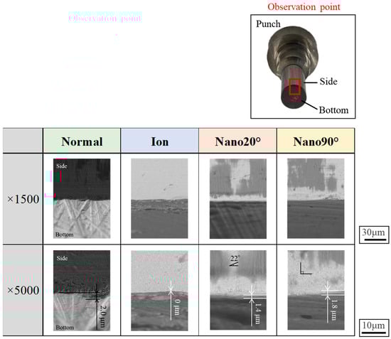 Four types of punches were used in this experiment, as listed in Figure 2: a normal punch with a mechanically ground edge; an ion-beam-treated punch with an edge sharpened by argon-ion irradiation; Nano20° and Nano90° punches with nano-grooved edges, with each width being 300 nm on their side surface at orientations of 20° and 90°, respectively, against their edges; and a femtosecond laser with a wave length of 515 nm, a pulse width of 200 fs, and a repetition rate of 20 MHz were utilized for nano-grooving [17].