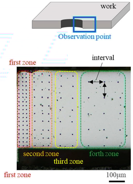 The work hardening zone of sheared electrical steel sheets was determined from the Vickers hardness map after cutting and polishing near the right side of the punched hole. The Vickers hardness tester (HM-100, Mitutoyo; Kawasaki, Japan) was used for mapping. The load was applied by 0.1 N for 10 s. The mapping scheme is shown in Figure 3. The hardness map was measured at three points with an interval of 25 μm on the first zone, at three points with an interval of 50 μm on the second zone, at two points with an interval of 75 μm on the third zone, and at three points with an interval of 100 μm on the forth zone. This hardness map is depicted by ten color-coded levels in each 25 HV. The personal error in measurement was suppressed to be lower than 15 HV, or 6% of the reference hardness of 250 HV for the electrical steel sheet without work hardening damages.