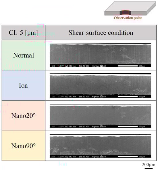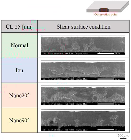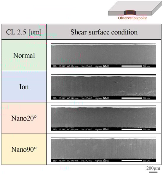 The sheared surface conditions attained using four punches were evaluated via SEM observation. Figure 5 compares four sheared surface conditions where δ = 25 μm or at CL25 μm. The fracture surface extends heterogeneously. In the case of CL5 μm in Figure 6, the fractured surface area ratio decreases and the burnished surface area ratio increases. Less-fractured surface areas are detected at CL2.5 μm in Figure 7.
