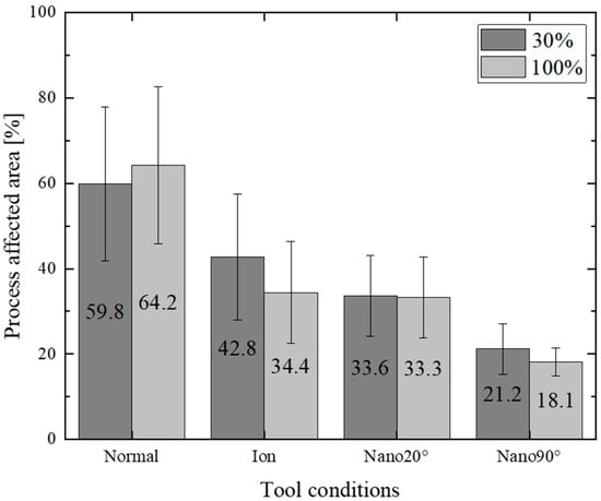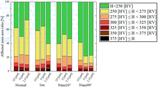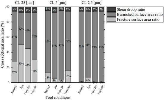As summarized in Figure 10, the fraction of each work hardening zone in the whole cross-sectional area is compared at each clearance and with each punching condition. When using the normal punch, the yellowed colored zone fraction becomes the maximum (51%) at CL2.5 μm. In case of the Nano90° punch, the yellowed colored zone fraction becomes the minimum (11%) at CL5 μm and CL2.5 μm. This fraction is less than the minimum fraction using the ion beam (i.e., 17% at CL2.5 μm) by 35%, and it is half of the minimum fraction attained using Nano20° (i.e., 22% at CL25 μm).