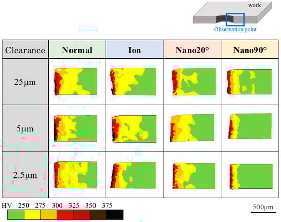 Hardness comparison of the work hardening zones for each clearance of CL25 μm, CL5 μm, and CL2.5 μm for the four punches.