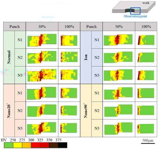 Hardness map of transients of the work hardening zone from a sheared state (30%) to a fully sheared state for the four punching conditions. Three shots—N1, N2, and N3—were performed in each shearing experiment.