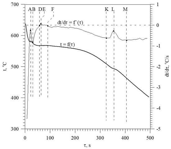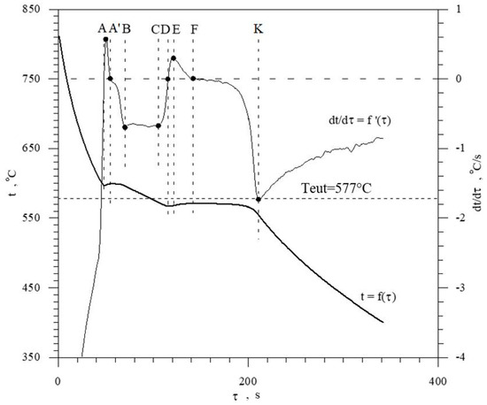 The figure shows two curves: t = f(τ) temperature with respect to time and its derivative dt/dτ = f′(τ) with marked characteristic points. These points are mainly local extrema of the derivative “dt/dτ” and the so-called zeros dt/dτ = 0. Point A determines the maximum thermal effect caused by the crystallization of the solid solution αAl, i.e., the moment of the most intense release of the latent heat of crystallization. Between points B and C, the crystallization of the αAl phase stabilizes, the temperature of the solid–liquid mixture decreases approximately uniformly, and the kinetics of thermal crystallization processes dt/dτ ≈ const. Then, the liquid is supercooled relative to the equilibrium eutectic transformation temperature Teut = 577 °C (for the Al-Si system), which initiates the onset of the αAl + β(Si) binary eutectic crystallization at point C. Points D and F are the temperature recalescence boundaries at t = f(τ) during the crystallization of the αAl + β(Si) binary eutectic. These are the points occurring when the minimum (point D) and maximum (point F) temperatures are recorded during the crystallization of the αAl + β(Si) eutectic mixture. The temperature difference between points F and D indicates temperature recalescence. Point E determines the maximum thermal effect of crystallization of the eutectic mixture, while point K determines the end of the binary eutectic crystallization and in this case the end of the liquid alloy solidification in the volume of the TDA probe.