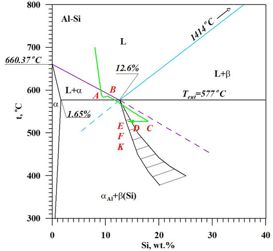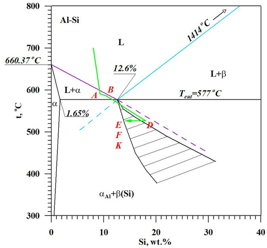 The diagram of the hypoeutectic alloy crystallization and the region of coupled growth of the αAl + β(Si) eutectic mixture are shown in Figure 2. The crystallization process of the hypoeutectic Al-Si alloy starts with the nucleation and growth of the αAl solid solution dendrites from a liquid overcooled vs. liquidus line. The heat of αAl-phase crystallization causes temperature recalescence, which terminates at point A′ (Figure 1). The crystallization front of αAl dendrites “rejects” Si atoms into the liquid, causing it to become richer in this element. After exceeding the above-mentioned point, the temperature of the liquid decreases, which leads to the initiation of αAl + β(Si) eutectic mixture crystallization. The leading phase during this crystallization is silicon, which is a good catalyst for the nucleation of the αAl phase. Point D represents the entrance into the region of the coupled growth of the αAl + β(Si) eutectic mixture. The crystallization heat of the binary eutectic mixture causes its maximum thermal effect to take place at point E, and the temperature rises to a value at point F. Crystallization terminates at point K.