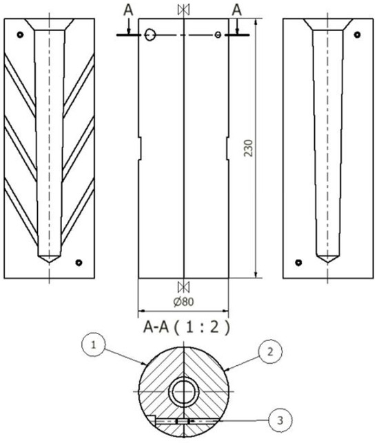 Die for test castings Ø20: 1—left part, 2—right part, 3—dowel pin (units: mm).