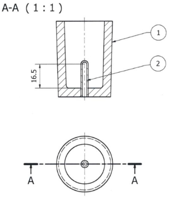 TDA probe: 1—shell mold; 2—quartz tube closed on one side (units: mm).
