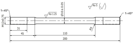 The static tensile test was conducted in accordance with UNE EN ISO 6892-1:2020 [23] on an INSTRON 4485 testing machine. This test determined the tensile strength UTS, the yield strength YS, and the relative elongation A. The tests were conducted at a rate of stress increase of R = 6 MPa/s (permissible value of R = 2–20 MPa/s). The strain rate was 0.0008 m/s. Hardness was measured using the Brinell method in accordance with ISO 6506-1:2014 [24]. A tungsten carbide ball was used as an indenter. The measurement was carried out on a degreased flat and smooth surface, free of oxide layers and impurities. The loading force was selected so that the indentation diameter d was in the range of 0.24 D < d < 0.6 D. The diameter of the ball was 2.5 mm, the load was 613 N, and the static load holding time was 30 s.