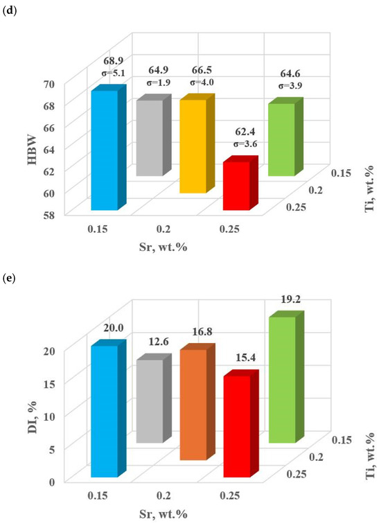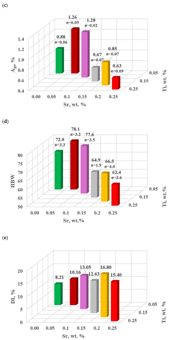 Since it is difficult to keep the concentration of individual elements in the alloy “exactly on point”, the following range of variation in the concentration of Sr = 0.02–0.04 wt.% and Ti = 0.06–0.08 wt.% after modification in the EN AC-46000* alloy was proposed in order to achieve simultaneously the highest possible UTS, YS, Agt and HBW properties and the lowest possible DI index value. In Table 15, Table 16, Table 17, Table 18 and Table 19, the selected ranges of Sr and Ti concentrations and the corresponding values of the analyzed properties or objective function in Table 20 are distinguished by bold+italic style.