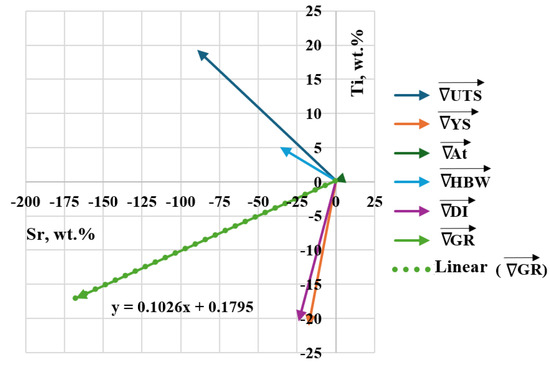 Table 6 shows the coordinates of the gradient vectors for each Output and the resultant gradient for the criterion of simultaneous maximization of stimulants (UTS, YS, A, HBW) and minimization of destimulant (DI). Graphically, the gradient vectors hooked to the point determined by D0 task are shown in Figure 10. The determined gradient vectors determine the direction of changes in the concentration of Sr and Ti modifiers allowing optimization of the selected (single) property of the alloy.