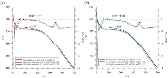 Thermal and derivative analysis of the alloy is sensitive to any changes in the technological process of making the liquid alloy—its physical and chemical state [33]. A change in chemical composition, carrying out treatments on the liquid alloy (e.g., modification, refining,...), or the lack thereof, are visible on TDA characteristics. Using the characteristic TDA quantities (t, τ, dt/dτ, d2t/dτ2), it is possible to develop statistical relationships—regression functions—that describe changes in the physical, or technological, properties of the alloy in the solid state. The developed models can be used to build a computer system for quality control of liquid alloy preparation. Immediately after measuring and recording the temperature of the alloy cooling and solidifying in the TDA probe, the preparation of the liquid alloy with the process guidelines can be carried out in a short time. As a result of non-compliance with the technological process, the pouring of the molds with the melt should be stopped and after pouring it from the transport ladle to the melting furnace, action should be taken to restore the correctness of the technological process. This avoids misguided melting and the associated cost of metal and molds that would yield castings with inappropriate properties.