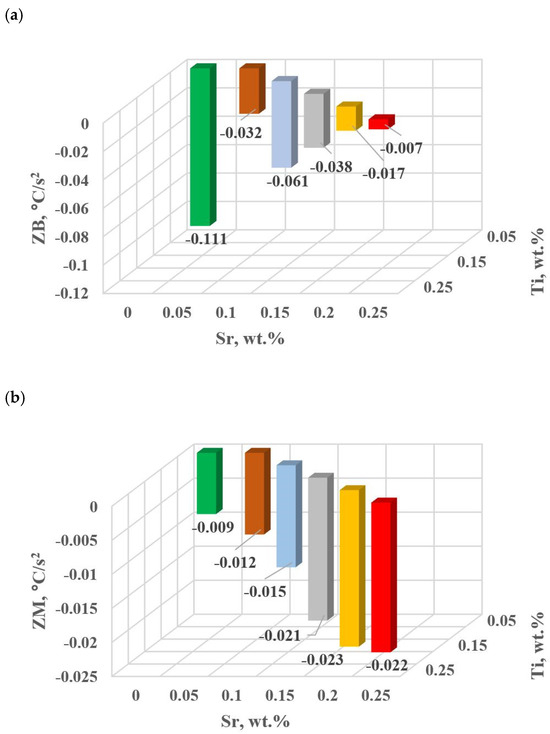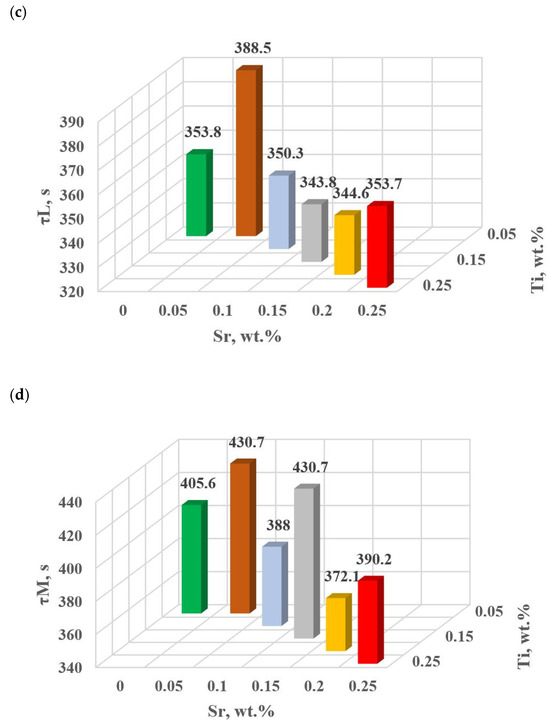 - The optimal modifier concentration range was determined: Sr = 0.02–0.04 wt.% and Ti = 0.06–0.08 wt.%, with the proviso that to maintain a low DI index, the concentration of Sr = 0.02 wt.% in the melt should be kept as low as possible,