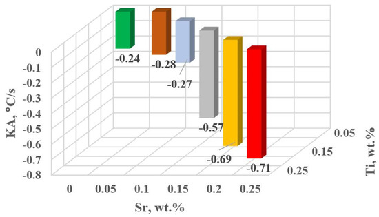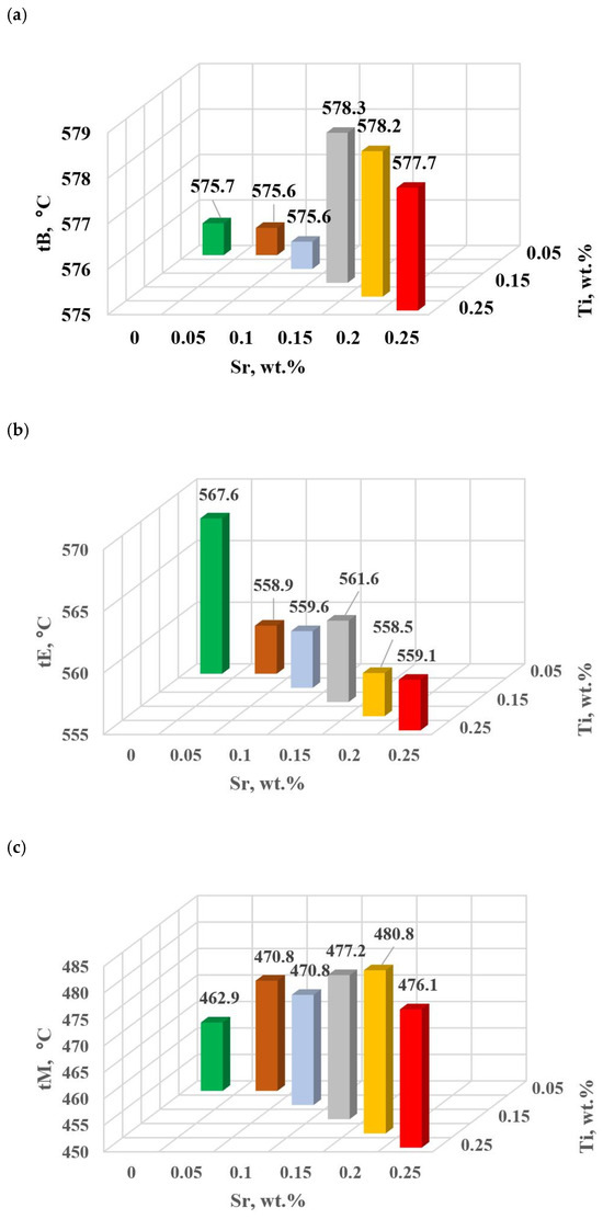 In Al-Si alloys, the effect of Ti on their microstructure and wear resistance was studied up to about 4 wt.% Ti [19]. With this amount, titanium forms intermetallic phases. Only a smaller addition of Ti at levels up to about 1.5 wt.% has a modifying effect on the microstructure of Al-Si alloys (an alloy that solidifies in an electric field) [20]. Based on studies [6,8,9] related to the effect of Ti as a modifier in Al-Si alloys, the same range of Ti concentration in the studied alloy was assumed as for Sr.